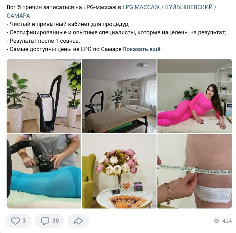 Ко мне обратилась Заказчица. Нужно было настройить таргет для небольшой студии. По услугам там только LPG и СПА-обертывания.